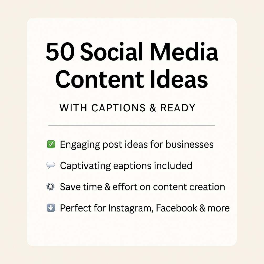 Unlock 50 Plug‑&‑Play Content Ideas for Small Businesses ✅ 50 ready‑to‑use post ideas tailored for small business owners 💬 Includes captivating captions for each idea — just copy & paste ⚙️ Save hours of brainstorming and content creation monthly 📥 Instant download, perfect for Instagram, Facebook & more Target Audience: Small business owners, social media managers, freelancers needing content ideas fast. Grab it now — start posting instantly!